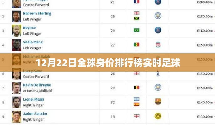 随着足球运动的普及和足球产业的飞速发展,足球运动员的身价也在不断刷新,本文将为您带来12月22日全球身价排行榜实时足球的最新动态。
